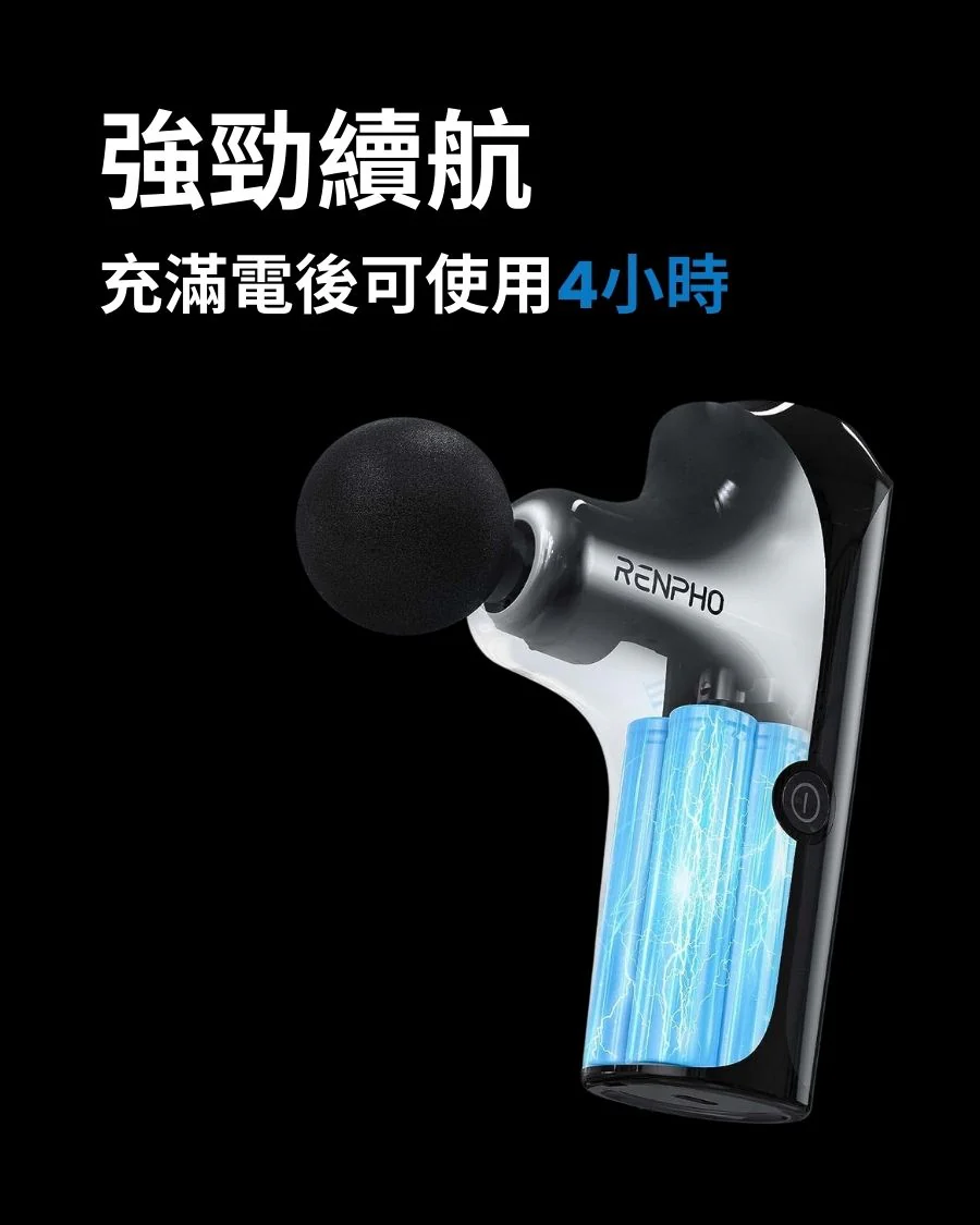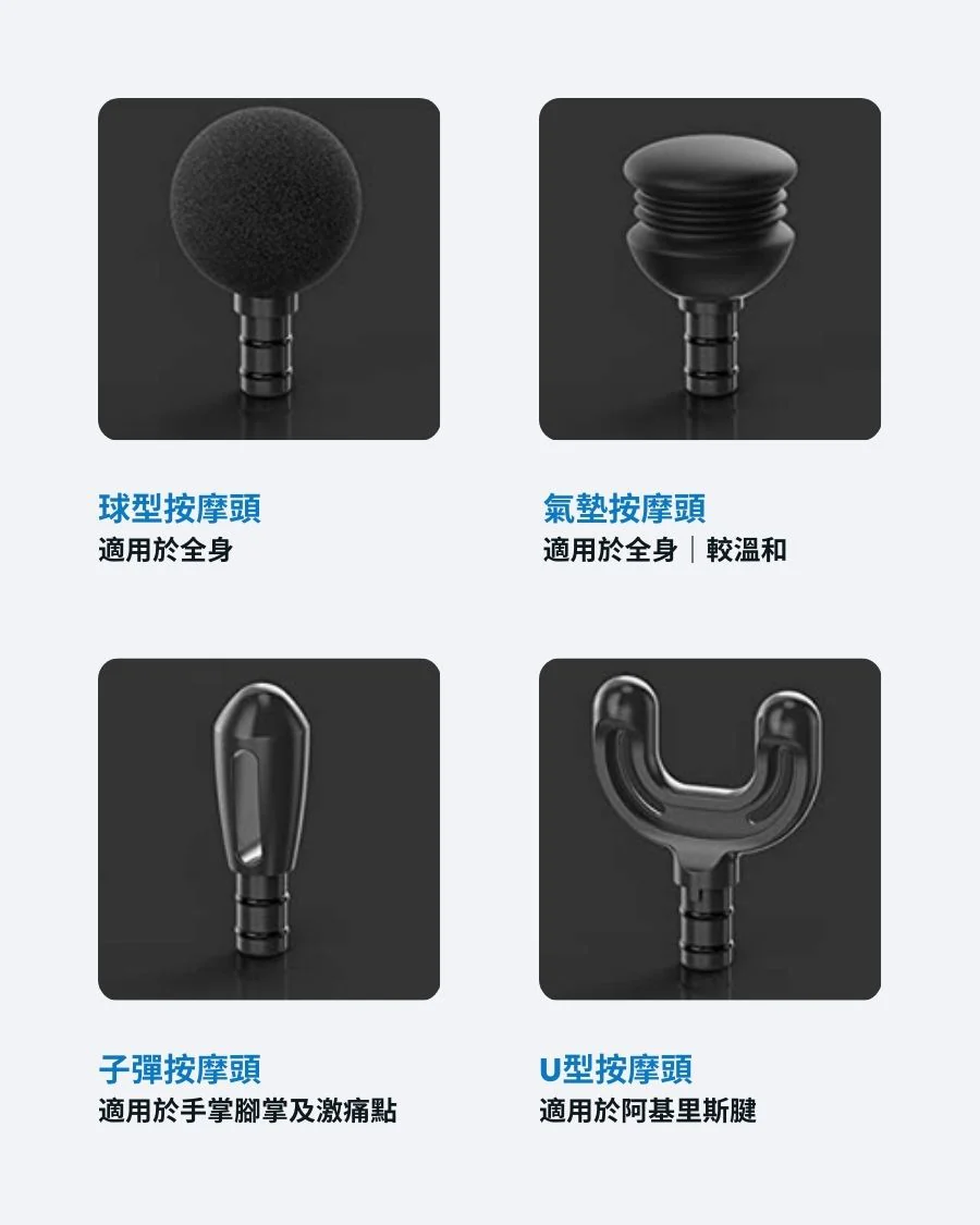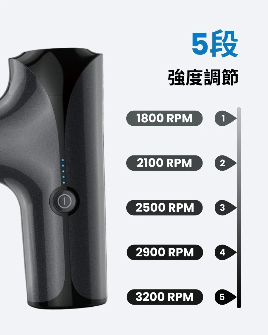 .5種強度,配合4款不同形狀的小型按摩槍頭,有助於緩解肌肉酸痛
