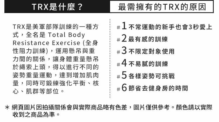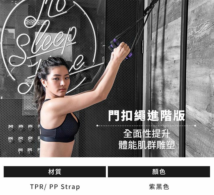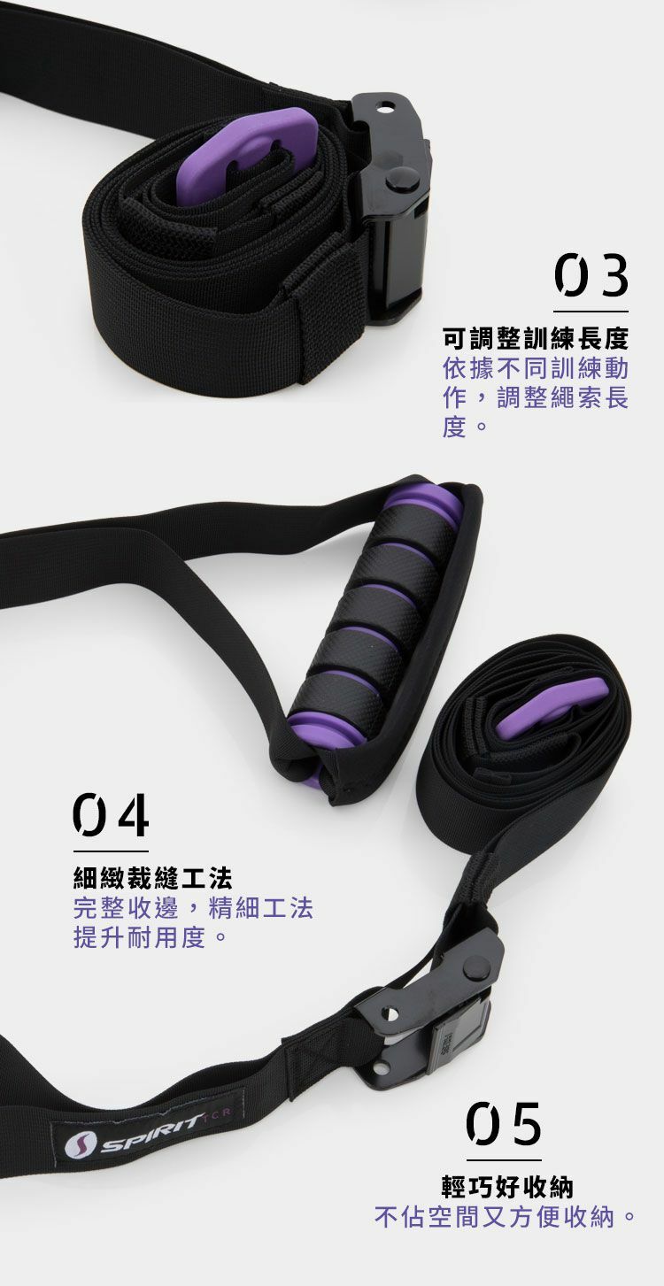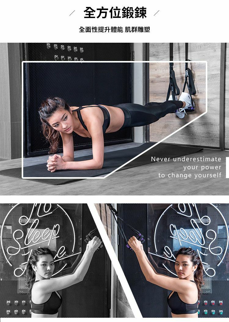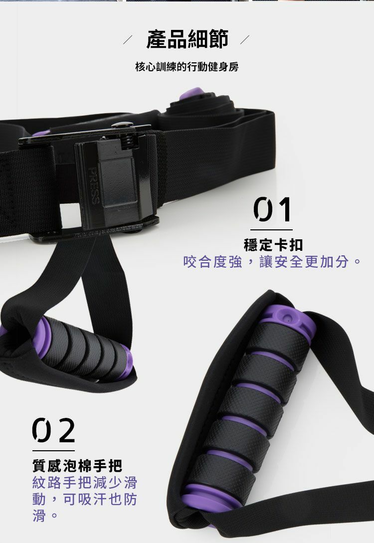 全方位核心訓練繩組,安全加固卡扣、質感防滑手把和細緻裁縫工法,讓懸吊訓練更加安全舒適,並可以依訓練需求自由調節長度,在家也可做到高強度的核心訓練,且輕巧好收納,讓運動無負擔。
