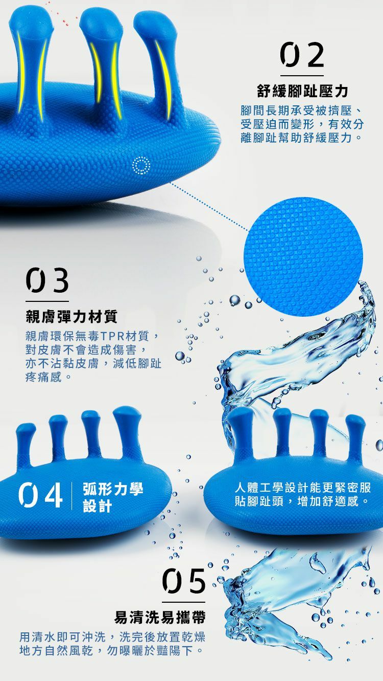 採用親膚環保無毒材質,特製超柔軟彈性結構、弧形力學設計舒適服貼腳趾間,徹底舒緩腳底筋膜、腳趾僵硬,久穿高跟鞋、久站服務業和運動員族群必備,保養腳趾和足部的按摩舒壓神器。