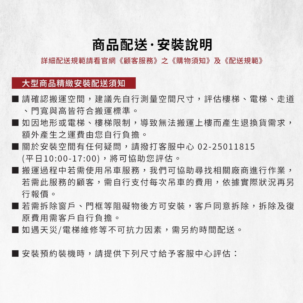 為保障您的權益,請於產品安裝前先行檢查商品外觀與內容物。如有任何問題,請立即向現場技師反映,避免後續爭議。