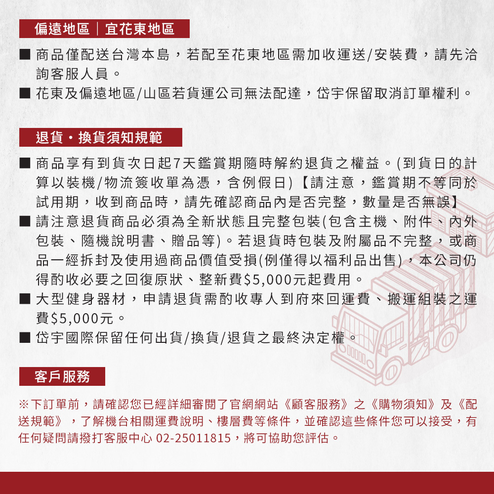 大型健身器材 (跑步機、健身車、飛輪、攀爬機等…)需要人工組裝之商品,退貨需酌收來回運費、搬運組裝之工費 5,000元 。