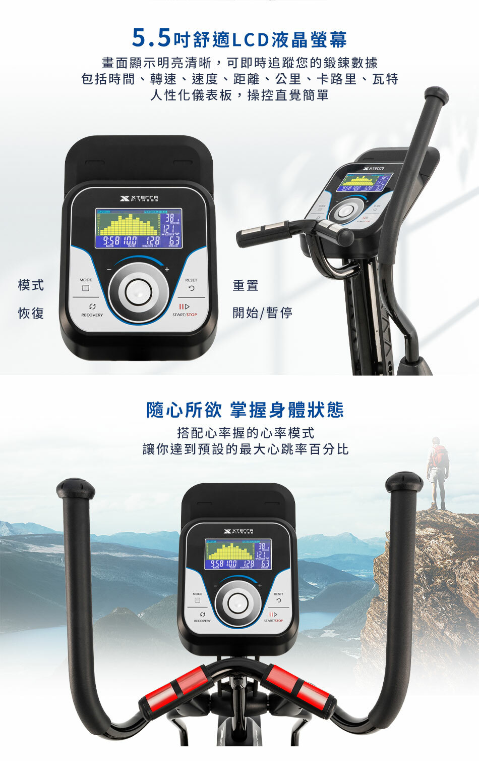 ● 心率感測握把與快捷調整手握運動把
