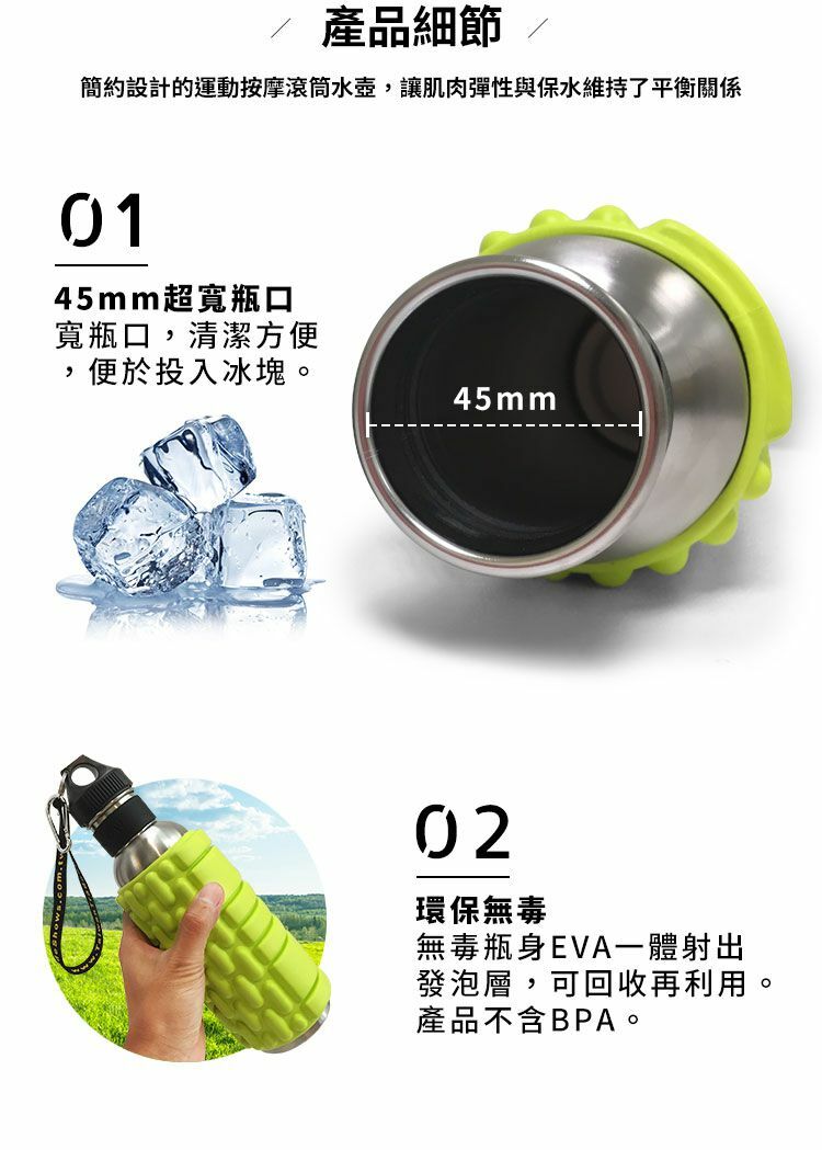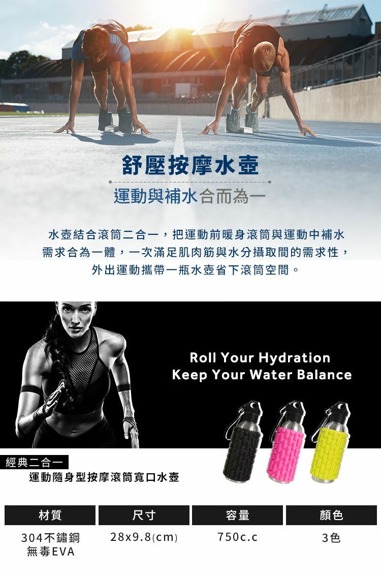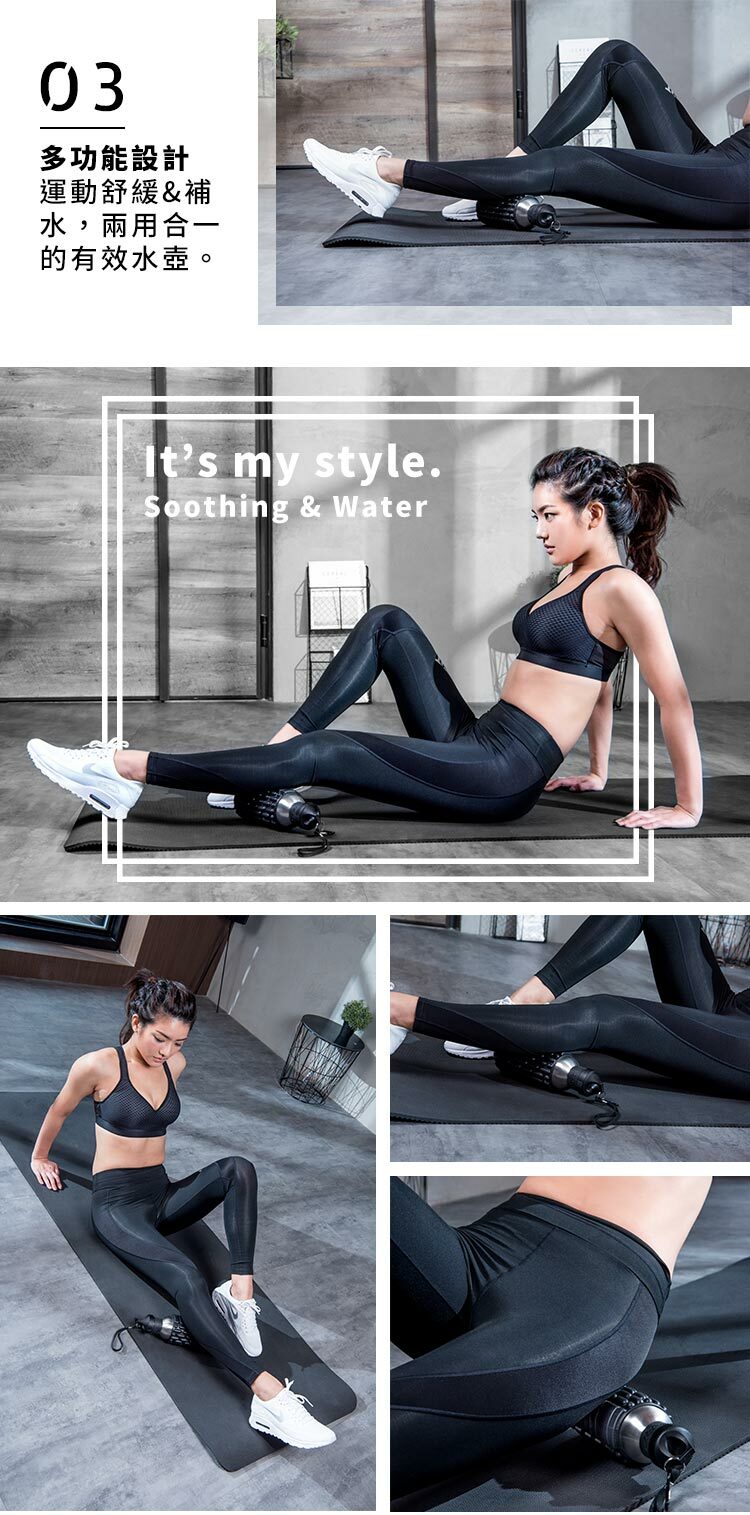 把運動前暖身滾筒與運動中補水需求合為一體,按摩滾筒水壺一次滿足肌肉筋與水分攝取間的需求性,外出運動只需攜帶一瓶,輕鬆省下空間。