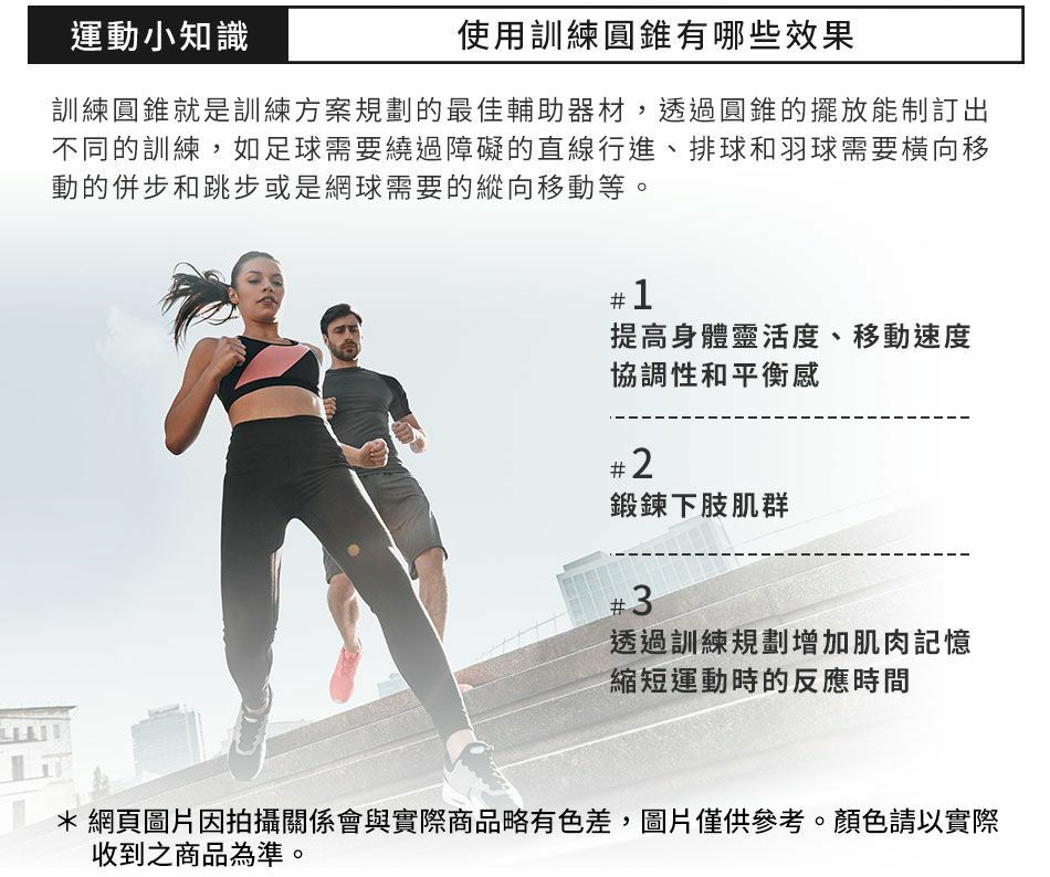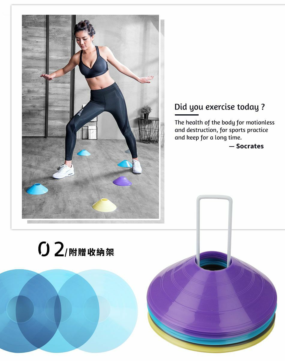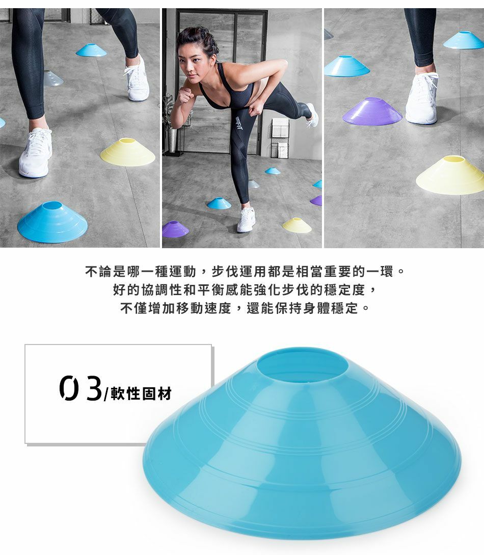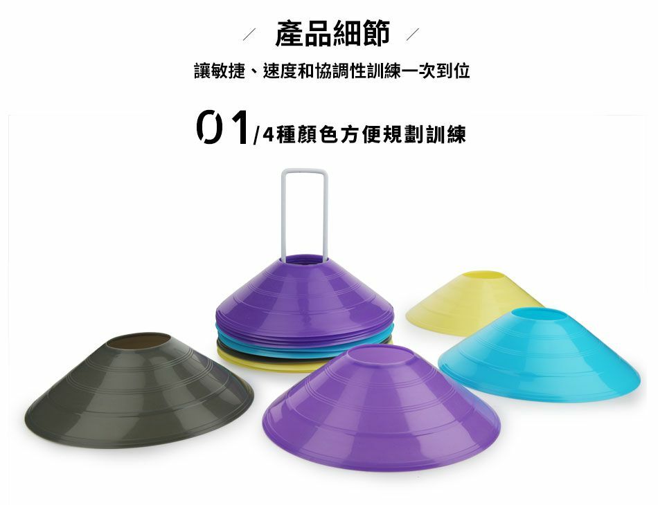 軟性固材和環保無毒材質,避免運動傷害等情況發生。角錐有4種顏色共20片,附贈收納架,方便整理清洗。