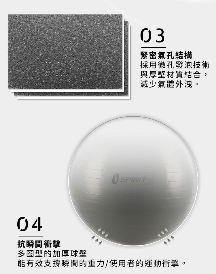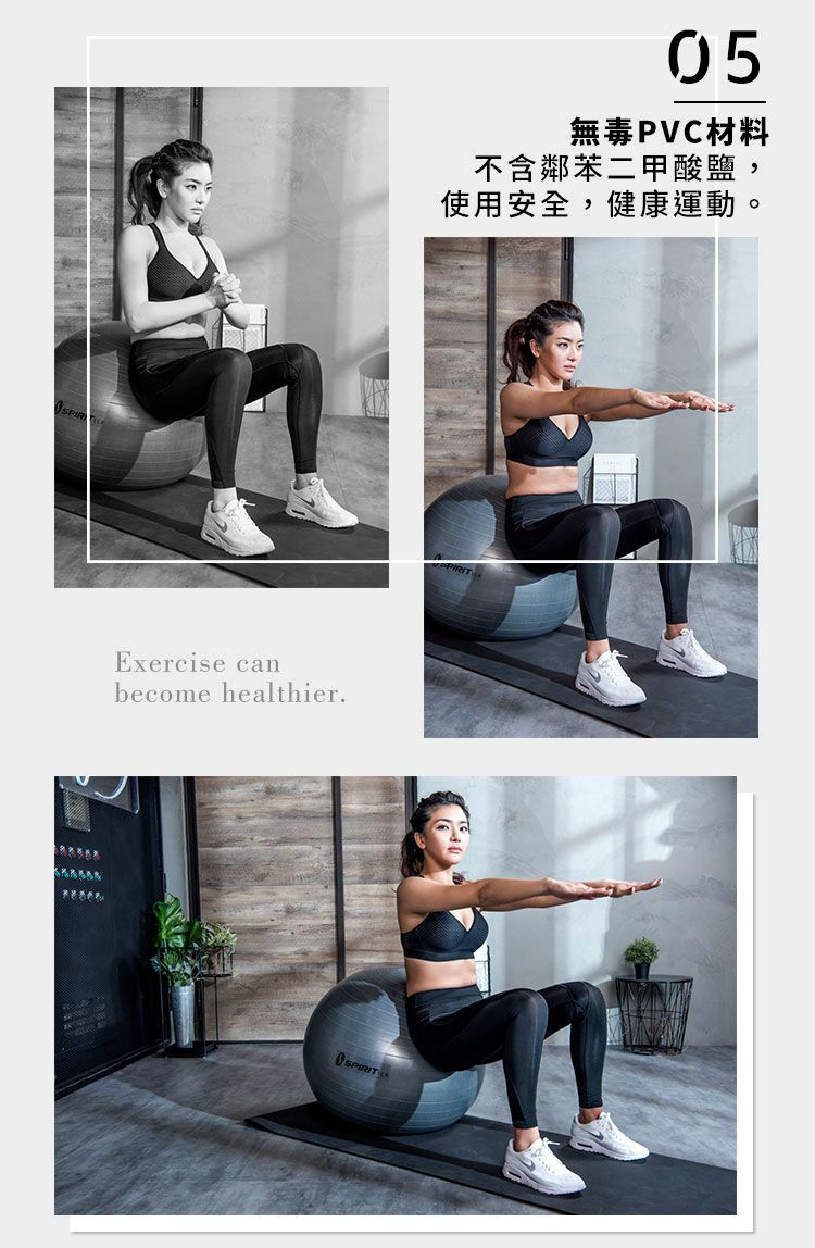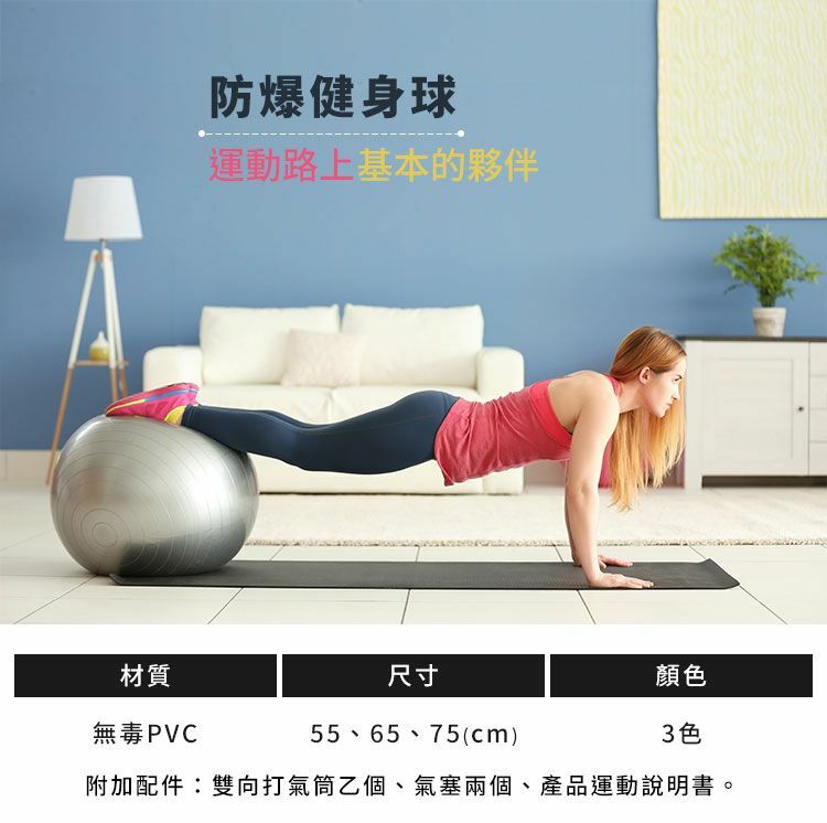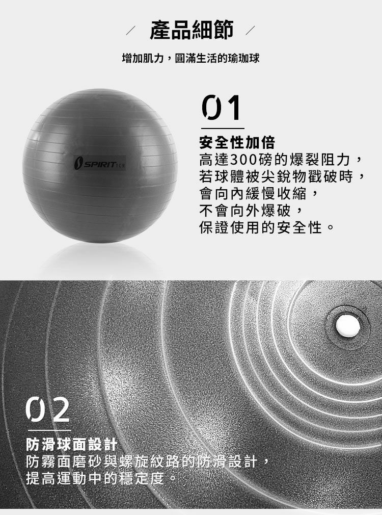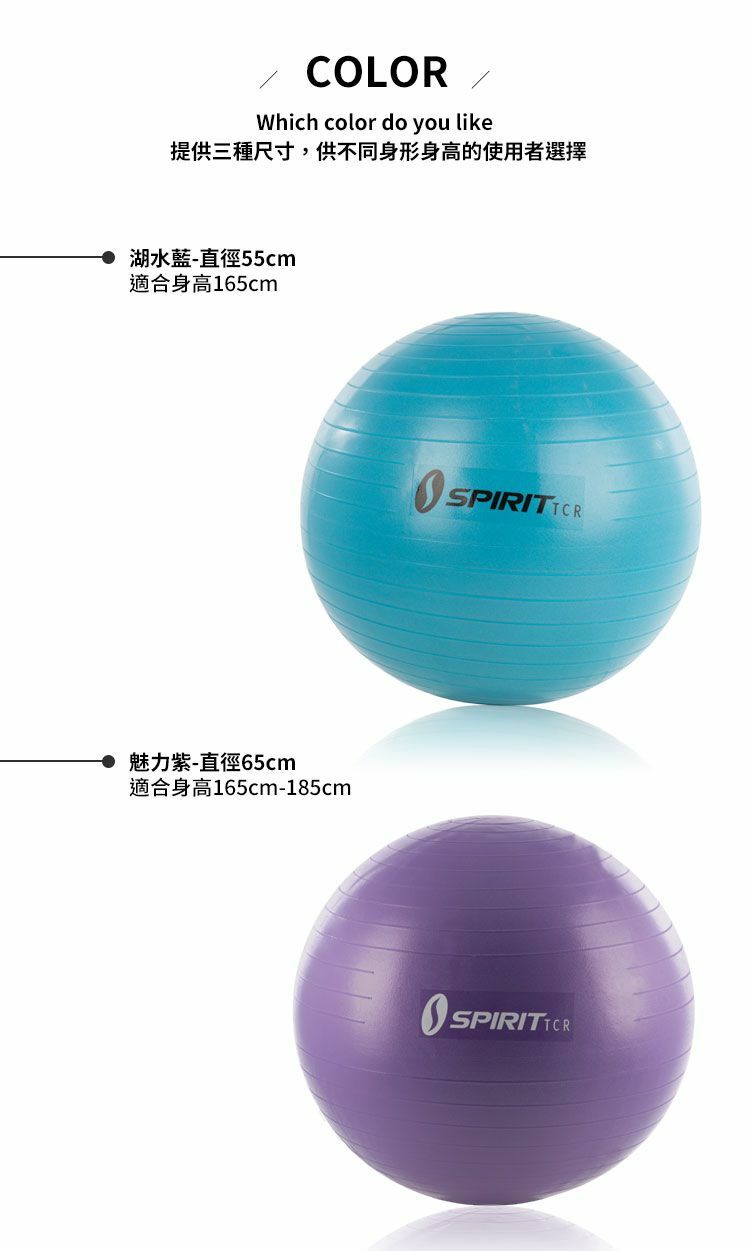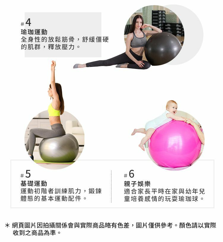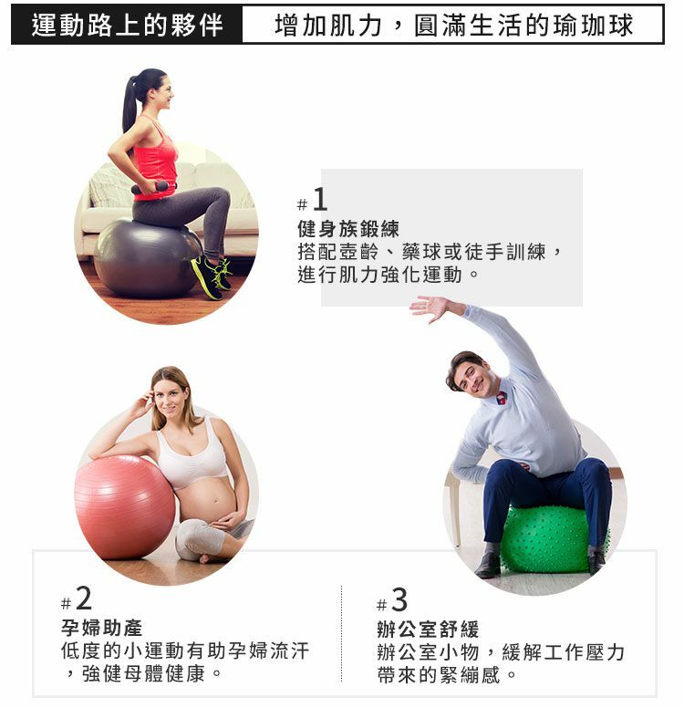 瑜珈健身球採用環保無塑化劑材質,以防爆小氣泡構成特殊霧面材質,足以承受14公斤的重力和尖銳物體,保障運動安全。瑜珈健身球對訓練核心、背、腿和髖部成效卓越,並有3種尺寸可供選擇。