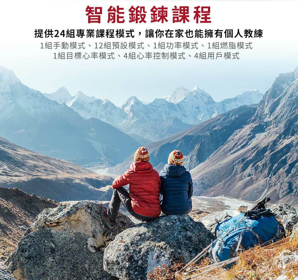 ● 內建24個應成程式,包括12組預設、4組心率、1個目標心率、4個自定、1個體脂、1個瓦特、1個手動
